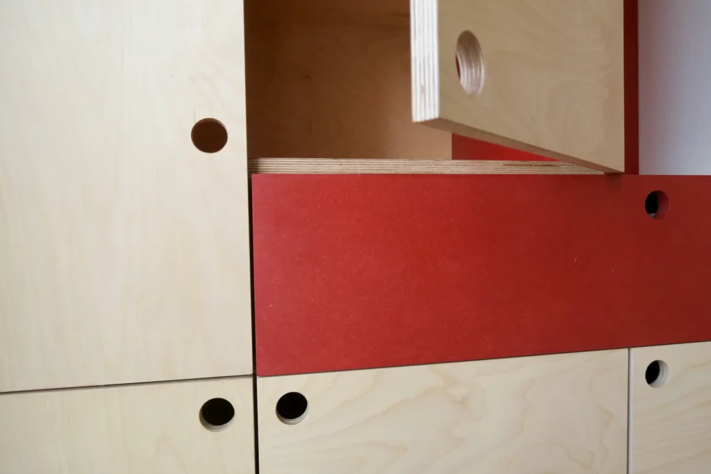 Dressing sur mesure en contreplaqué bouleau et Valchromat rouge pour une chambre d’enfant rangée et pleine de peps