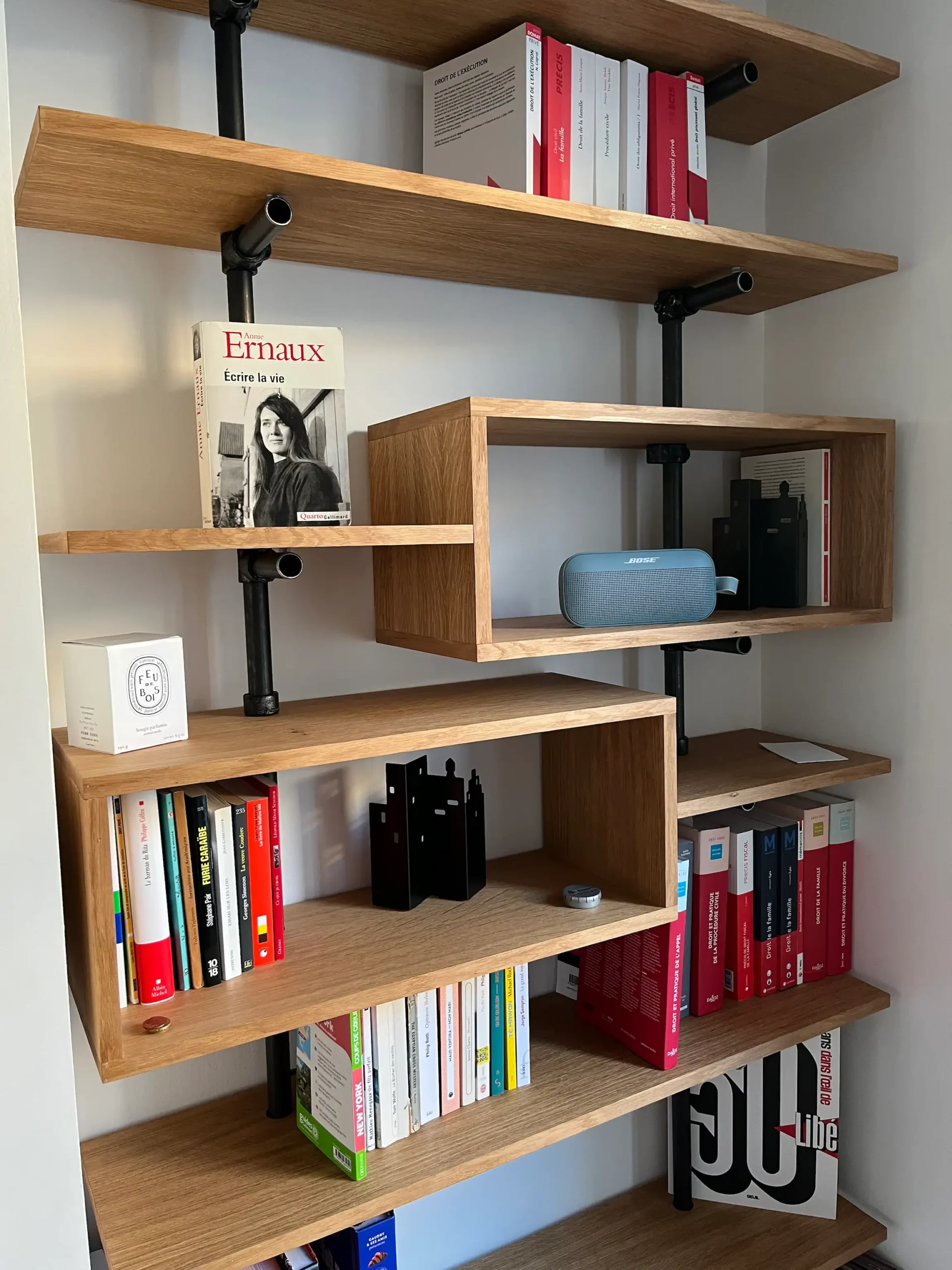 Bibliothèques sur mesure en chêne et acier avec hauteur d’étagères modulable pour un esprit loft industriel