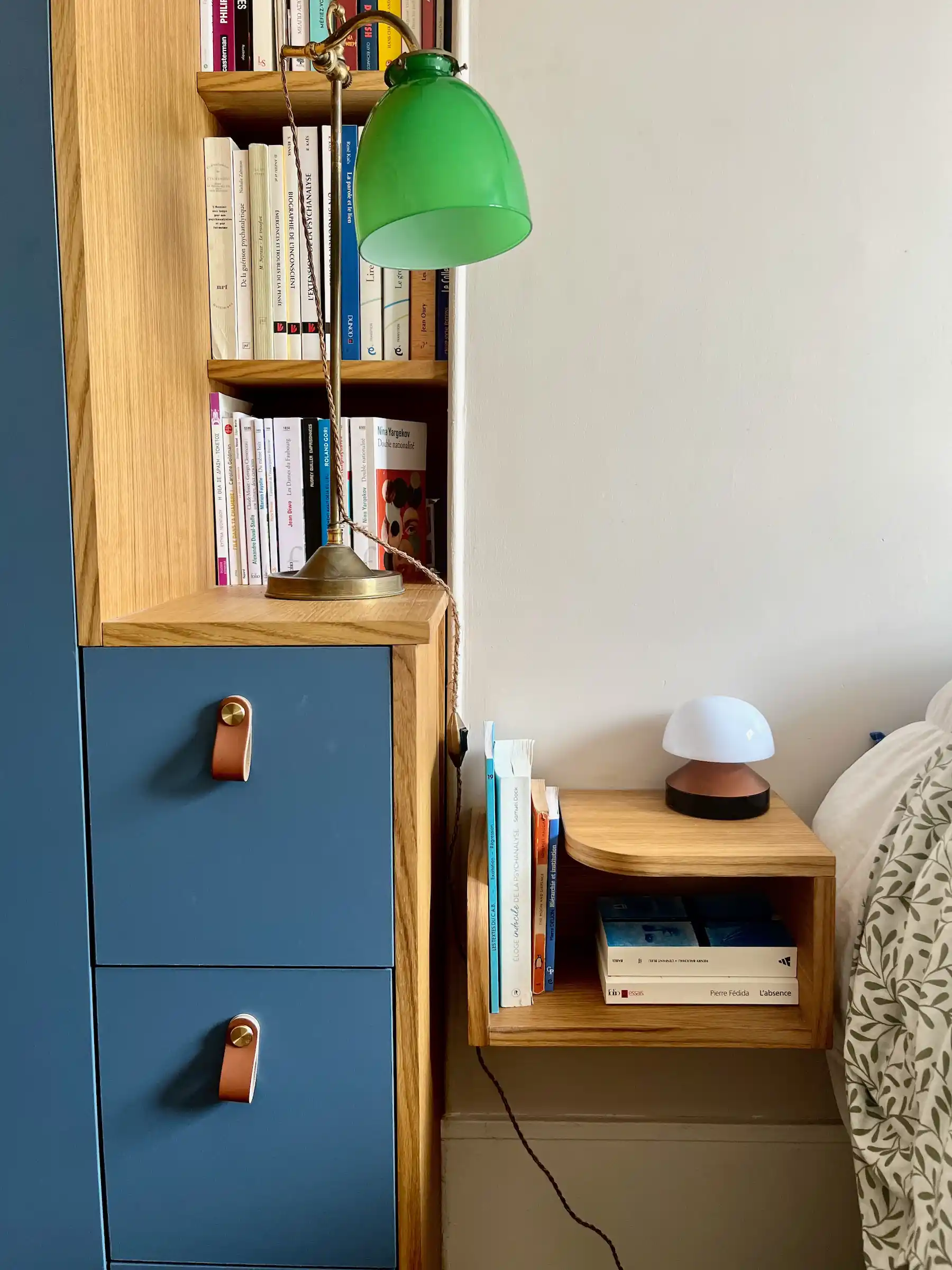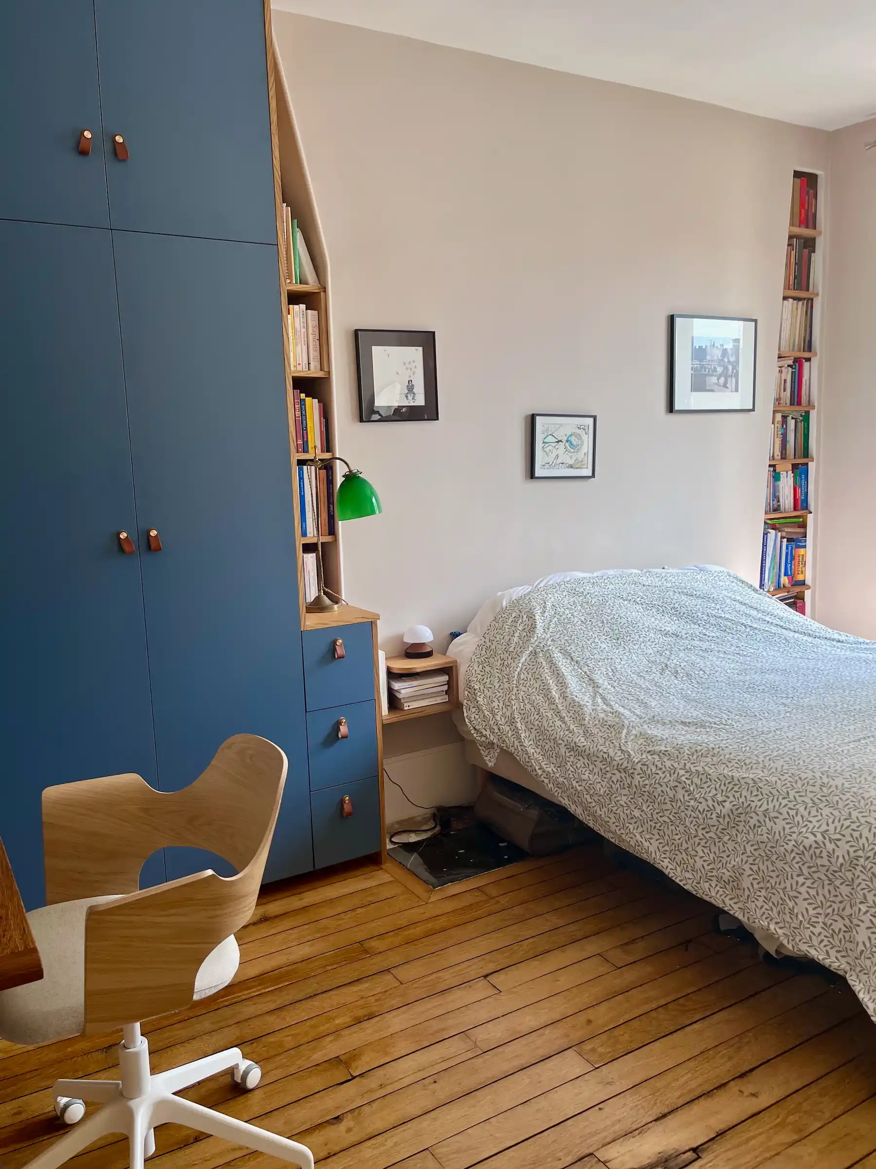 L’intégration parfaite et l’écho à la niche bibliothèque déjà présente offre un espace parfaitement harmonieux et enveloppant.