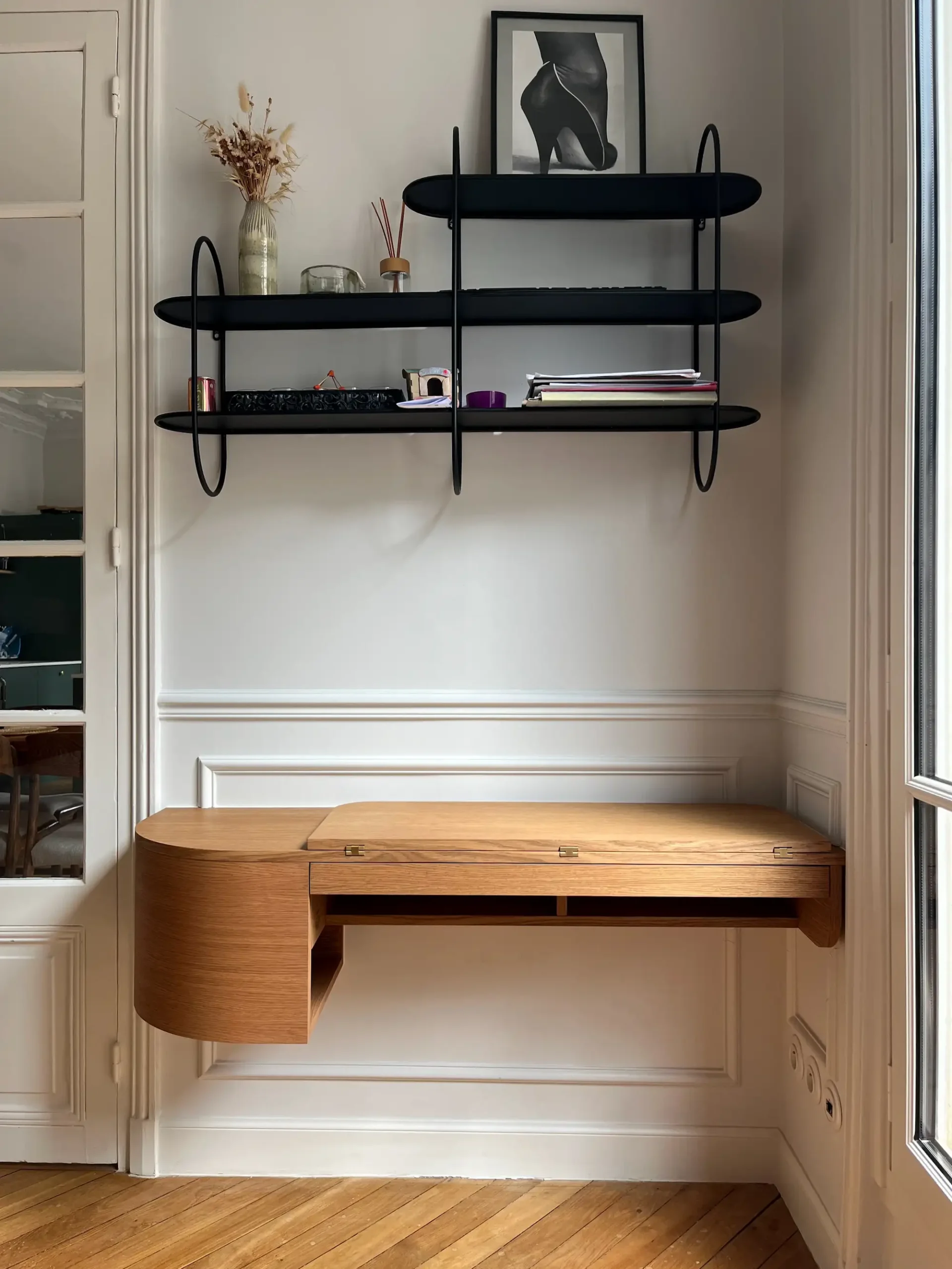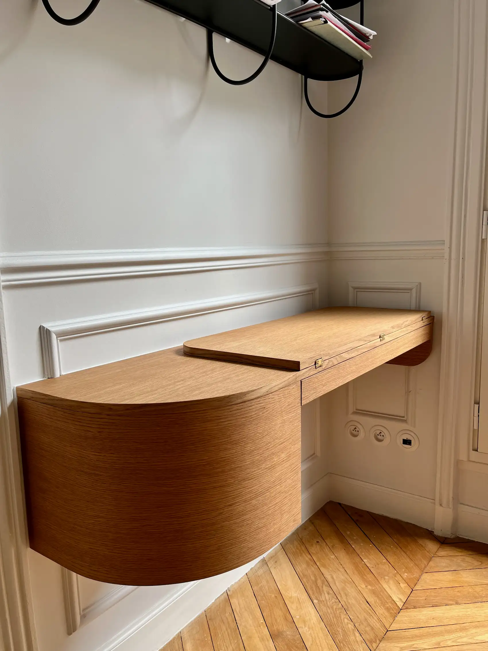 Bureau design sur mesure en plaqué chêne L’abattant permet d’agrandir l’espace de télétravail pour un espace confortable, et se range pour un gain de place au quotidien. Les courbes du meuble apportent douceur et espace de rangement discrets.